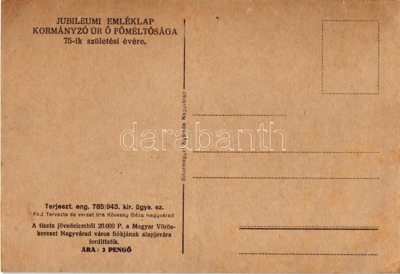 1868-1943 Vitéz Nagybányai Horthy Miklós országgyarapító kormányzó urunkat meleg szeretettel köszönti a magyar nép 75. születése évében. Jubileumi emléklap kormányzó úr Ő Főméltósága 75. születési évére. A Magyar Vöröskereszt Nagyvárad város fióikjának alapjavára / Memorial postcard for the 75th birthday anniversary of Regent Horthy, Hungarian irredenta propaganda (EK)
