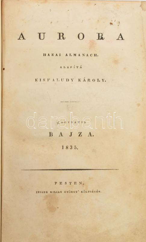 1835 Aurora. Hazai almanach. Alapítá Kisfaludy Károly. Folytatja Bajza [József.] XIV. évf. vagy új folyamat IV. éve. Pest,1835,Ifj. Kilian György. Korabeli aranyozott félbőr kötésben 1t. (litográfia) 425p. 5 t acélmetszetek Az utolsó 3 tartalom oldal másolattal pótolt igényesen