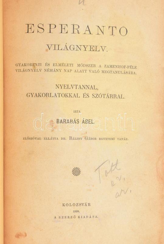 Barabás Ábel. Esperanto világnyelv. Gyakorlati és elméleti módszer a Zamenhof-féle világnyelv néhány nap alatt való megtanulására. Nyelvtannal, gyakorlatokkal és szótárral. Kolozsvár, 1898, szerzői. VI + (+2) + 206 p. Későbbi aranyozott gerincű egészvászon-kötés, foltos borítóval, körbevágva, címlapon ceruzás bejegyzéssel, néhány lapon tollas jegyzetekkel, néhány kevés lap kissé foltos.