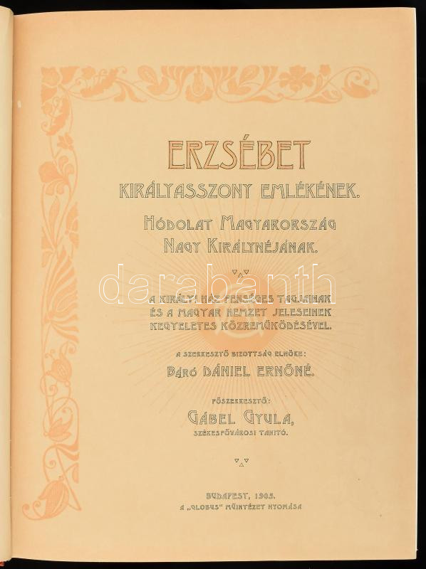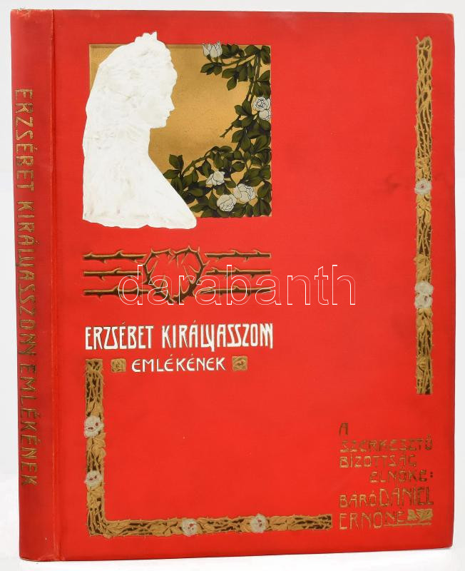 Erzsébet királyasszony emlékének. Hódolat Magyarország nagy királynéjának. A királyi ház fenséges tagjainak és a magyar nemzet jeleseinek kegyeletes közreműködésével. A szerkesztő bizottság elnöke: Dániel Ernőné. Főszerkesztő Gábel Gyula. Bp., 1905, Globus, 176 p. Gazdag szövegközti és egészoldalas képanyaggal. Kiadói aranyozott, festett piros egészvászon-kötésben, Gottermayer-kötés, a borítón kis kopásnyomokkal.