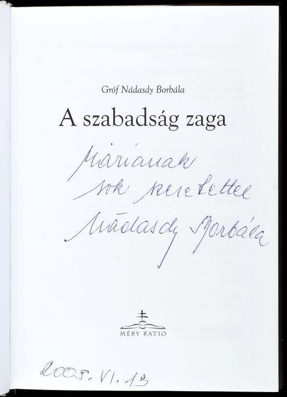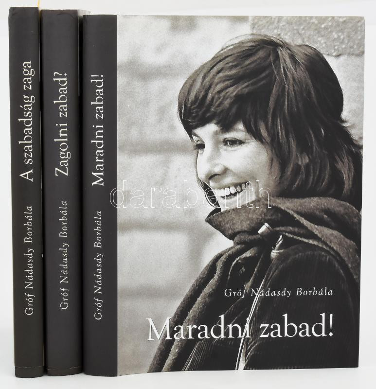 Gróf Nádasdy Borbála 3 műve (az egyik dedikált!): A szabadság zaga. Gróf Nádasdy Borbála (1939-) által DEDIKÁLT! H.n., 2009, Méry Ratio. Első kiadás. 216 p. Kiadói kartonált, papírkötés, kiadói papír védőborítóval. + Zagolni zabad? H.n., 2008, Méry Ratio. Első kiadás. 251+1 p. Kiadói kartonált, papírkötés, kiadói papír védőborítóval, utolsó néhány alja kissé hullámos. + Maradni zabad! H.n., 2010, Méry Ratio. Első kiadás. 263 p. Kiadói kartonált, papírkötés, kiadói papír védőborítóval.