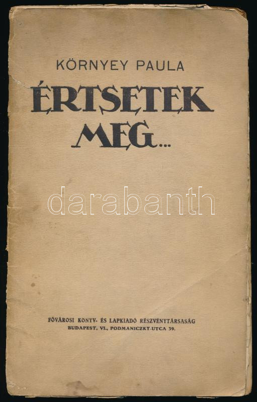 Környey Paula: Értsetek meg....Versek. A szerző, Környey Paula, Környey (Környei) Paula (1899-1996) színésznő, költő, esszéista által ALÁÍRT és DEDIKÁLT példány! Bp., é.n., Fővárosi Könyv- és Lapkiadó Rt.. Kiadói papírkötés, sérült gerinccel, foltos és kissé sérült borítóval, kijáró lapokkal.