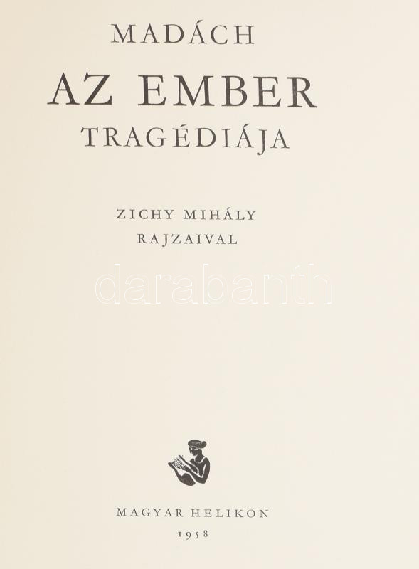 Madách Imre: Az ember targédiája. Zichy Mihály egészoldalas illusztrációival. Bp., 1958, Magyar Helikon. Kiadói félbőr-kötésben, papír védőborítóban, jó állapotban. Számozott (1621./2100), bibliofil példány. hibátlan állapotban