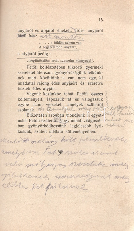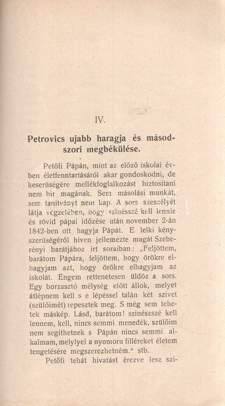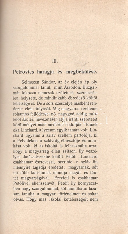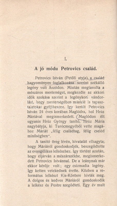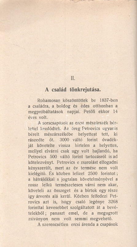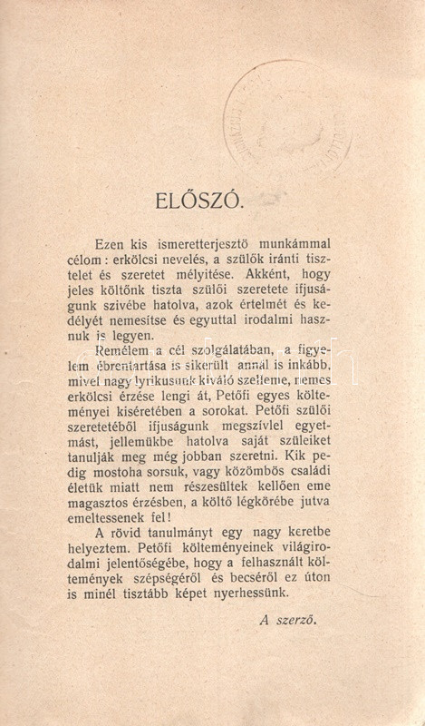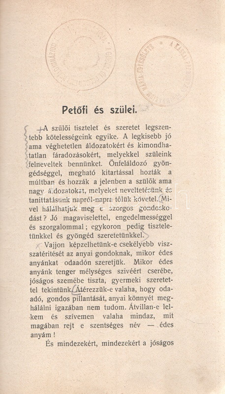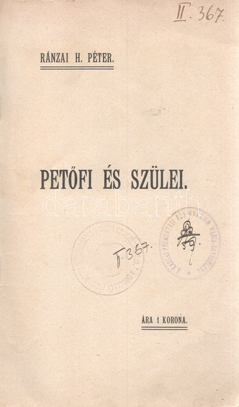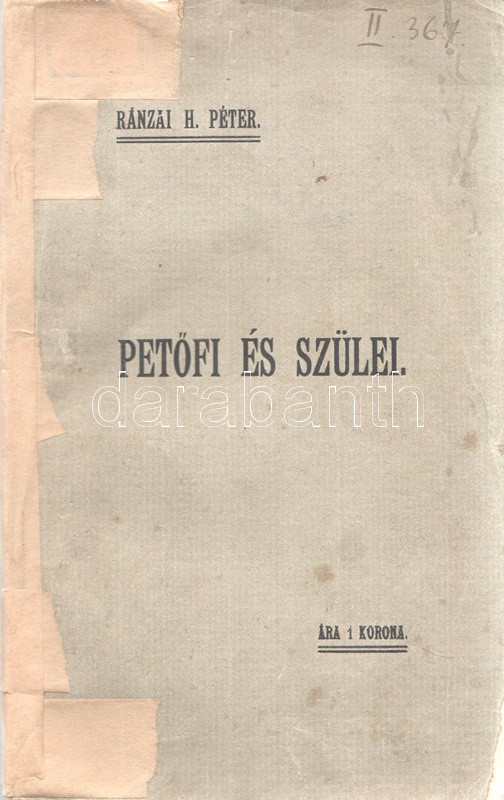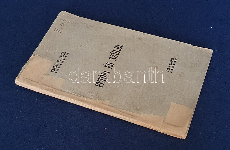 Ránzai H. Péter: Petőfi és szülei. (Kassa, 1909. Szent Erzsébet Nyomda Rt.) 89 + [3] p. Első kiadás. Ránzai H. Péter Petőfi-kutató erkölcsnemesítési céllal írt irodalomtörténeti tanulmánya. Részlet az előszóból: ,,Ezen kis ismeretterjesztő munkámmal célom: erkölcsi nevelés, a szülők iránti tisztelet és szeretet mélyítése. Akként, hogy jeles költőnk tiszta szülői szeretete ifjúságunk szívébe hatolva, azok értelmét és kedélyét nemesítse, és egyúttal irodalmi hasznunk is legyen. A tartalomból: A jómódú Petrovics-család - A család tönkrejutása - Petrovics haragja és megbékülése - Petrovics újabb haragja és másodszori megbékülése - A kiengesztelt család - Petrovicsék Szalkszentmártonban - Petőfi szülői Dömsödön, Pesten, majd Cinkotán - Petőfi szülei Vácott - Petőfi magához veszi szüleit - A szétszórt család; Petőfi szülei halála. Példányunk első két fejezetének oldalain ismeretlen kéztől (a szerzőtől?) származó korrektúrázási széljegyzetek. A címoldalon és az előszó oldalán régi gyűjteményi bélyegzések, illetve katalógusszám. Poss.: A Kassai Premontrei Főgimnázium Mária-egyesülete; a Gödöllői Premontrei Főgimnázium Mária-kongregációja. Fűzve, javított kiadói borítóban, az első borítón katalógusszámmal. Jó példány.