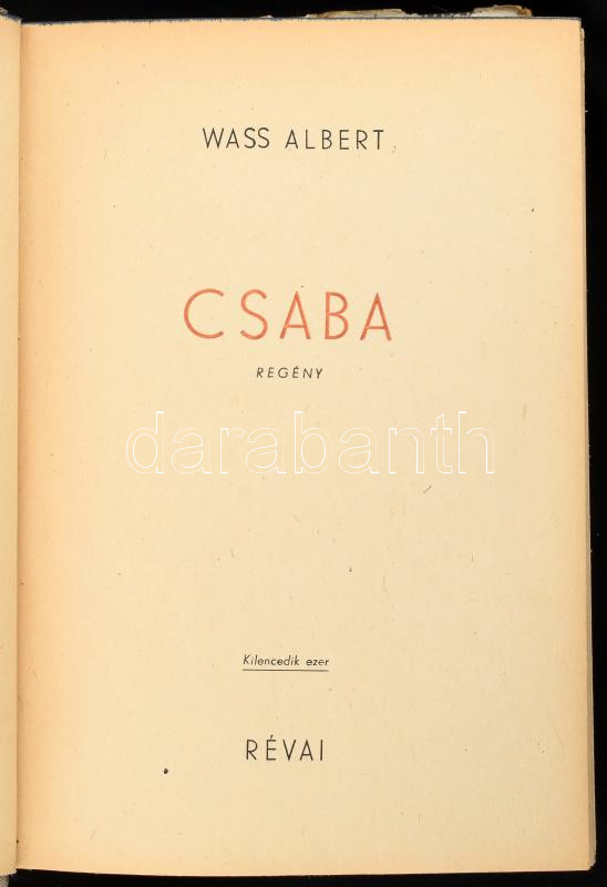 Wass Albert: Csaba. Regény. Bp., (1944.), Révai. Kiadói kissé kopott f... https://www.darabanth.com/hu/474-Gyorsarveres/474.0/Konyvek/Konyvek-Egyeb-ritkasagok~1000004/Wass-Albert-Csaba-Regeny-Bp-1944-Revai-Kiadoi-kisse-kopott-felvaszon-kotes-kiadoi~II3217293