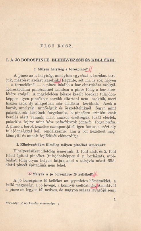 Szövegközti ábrákkal illusztrált, bevezető jellegű borászati munka, főként a szüretelés utáni munkafázisokról, a borok készítéséről, javításáról, eladásáról, vételéről és felszolgálásáról; a magyar és külföldi bortípusok és borvidékek részleteivel. Az elsősorban a vendéglátás szakembereinek készült kötet végén a sörrel kapcsolatos tudnivalók. Számos oldalon szövegkiemelések, aláhúzások.