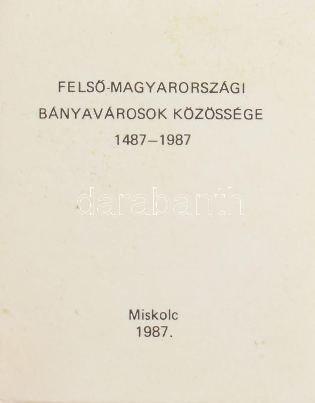 Leírás: Tóth Pál (szerk.): Felső-Magyarországi Bányavárosok Közössége 1487-1987. Miskolc, 1987, Miniatűrkönyv Gyűjtők Klubja. Kiadói műbőr kötés, plakett nélkül. Megjelent 500 példányban. MInikönyv
