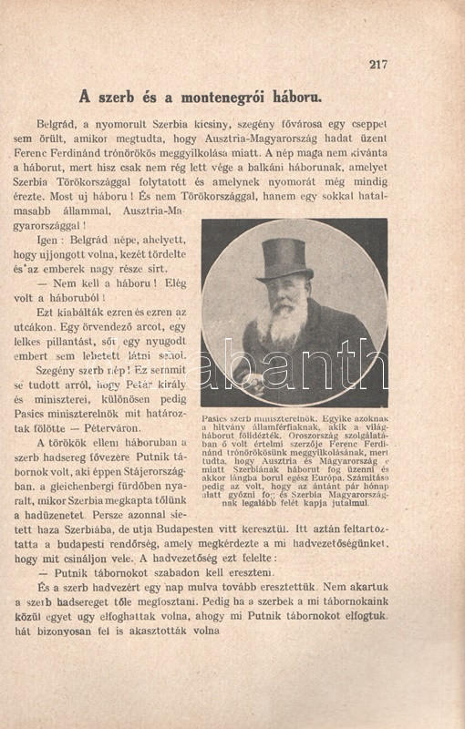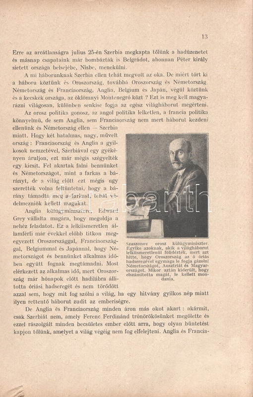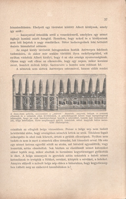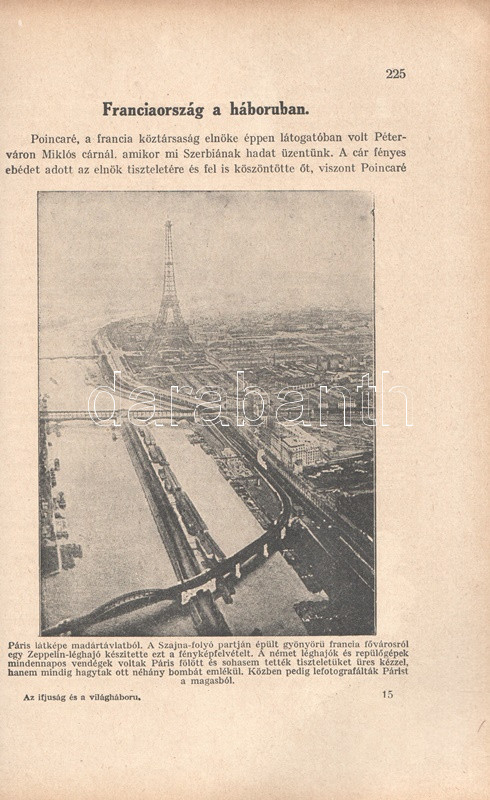 Seress Imre: Az ifjúság és a világháború 1914-1915. A világháború története az ifjúság számára. Több száz arcképpel, csataképpel és eredeti harctéri felvétellel. I. kötet. Budapest, [1916]. Magyar Kereskedelmi Közlöny Hírlap- és Könyvkiadóvállalat (Tolnai Világlapja ny.) 412 + [4] p. Egyetlen kiadás. Az 1901-1944 között megjelenő Tolnai Világlapja a korszak népszerű, képes hetilapja volt, a világháborús propagandából laptársaihoz hasonlóan bőven kivette a részét (nem magyar sajátosság, az összes hadviselő fél sajtója rendszerszerűen torzította az információkat). Az ifjúság számára készült hazafias kiadványt eredetileg egykötetesre tervezték, ám a háború elhúzódása miatt végül három kötet jelent meg. I. kötetünk a világháború okait járja körbe, illetve az első két év hadi eseményeit foglalja össze. Kiadványunk látószöge szerint a háború kirobbantásában a felelősséget a barbár orosz állam, a lelketlen és kufár természetű Anglia, a felelőtlen Franciaország felelős, a derék központi hatalmak csupán védekező harcot folytatnak. Az oldalszámozáson belül gazdag szövegközti képanyaggal illusztrált beszámoló szövegei az általános hadműveleteken kívül számos harctéri anekdotát közölnek, méltatják a központi hatalmak leleményességét, bajtársiasságát, vitézségét, helytállását, magas erkölcsiségét és műszaki zsenialitását, mindezt pedig szembeállítja a világot végigrabló antant hatalmak manipulatív hatalmával, amely saját országain belül koncentrációs táborokba gyűjti az ott rekedt magyarokat, osztrákokat, németeket, saját csapatait gyarmati csapatokkal egészíti ki, arab, néger, zulu, hindu kiegészítő csapatait golyófogónak használva, orv- és lestámadásaival megkeserítve a bevonuló német és osztrák-magyar seregek életét. A képaláírásokban megkapó tömörséggel tanulmányozható a beszámoló elfogultságának mértéke: ,,II. Vilmos német császár, királyunk hű szövetségese", ,,Viktor Emánuel olasz király, aki a háború elején még szövetségesünk volt, de nemcsak hogy nem jött segítségünkre, hanem hitszegően ellenünk fordult. A történelem örökre meg fogja bélyegezni", ,,Péter szerb király, az orosz cár engedelmes, vak eszköze", ,,Orosz lovasok és gyalogosok éjjel lövöldöznek egy mozdonyra, amelyet a mi csapataink előreküldtek, hogy a síkságot kémlelke ki. A mozdonyon levő katonáink fényszóróval bevilágítják a környéket és gépfegyverekkel tüzelnek vissza", ,,Német katonák a galíciai harctéren fölkapnak egy parasztszekérre, hogy meneküljenek egy század kozák elől. A németek mindössze hatan-heten vannak, ezek közt kettő is sebesült, mégsem gondolnak arra, hogy megadják magukat, hanem bátran lövöldöznek a támadóikra a szekérről", ,,Zulu-kaffer szerecsenek Angliának afrikai gyarmataiból. Inkább majmokhoz hasonlítanak, mint emberekhez, és Anglia mégsem szégyellte Európába hozni őket, hogy mint az ő katonái harcoljanak a németek ellen", ,,Páris látképe madártávlatból. A Szajna partján épült gyönyörű francia fővárosról egy Zeppelin léghajó készítette ezt a felvételt. A német léghajók és repülőgépek mindennapos vendégek voltak Páris fölött, és sohasem tették tiszteletüket üres kézzel, hanem mindig hagytak ott néhány bombát emlékül. Közben pedig lefotografálták Párist a magasból", ,,Török gyalogos katonák a táborban, a Dardanelláknál. Fegyvereiket gúlákba rakva várják az angolok, franciák, hinduk, kanadaiak és ausztráliaiak támadását, amelyeket mindig diadallal vertek vissza. A Dardanellák hősies védelme egyike volt a legnagyobbszerű haditetteknek, amelyeket ez a világháború felmutatott". Kötetünk fejezetei döntően az európai hadszíntérre koncentrálnak, különös tekintettel a Monarchia és Oroszország küzdelmeire, ám a hitszegő diplomáciai manőverezés részleteire is kitérnek, a gyarmati háborúra is, majd a nem hadviselő európai felek kontextusát is felmérik. Színes, illusztrált előzékekkel. Színes, illusztrált, dombornyomásos és vaknyomásos kiadói egészvászon kötésben.