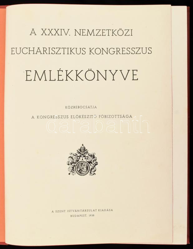 A XXXIV. Nemzetközi Eucharisztikus Kongresszus emlékkönyve. Közrebocsájtja a Kongresszus előkészítő főbizottsága. Bp., 1938, Szent István-Társulat. Fekete-fehér fotókkal illusztrálva. Kiadói aranyozott egészvászon kötés, kissé kopott borítóval.