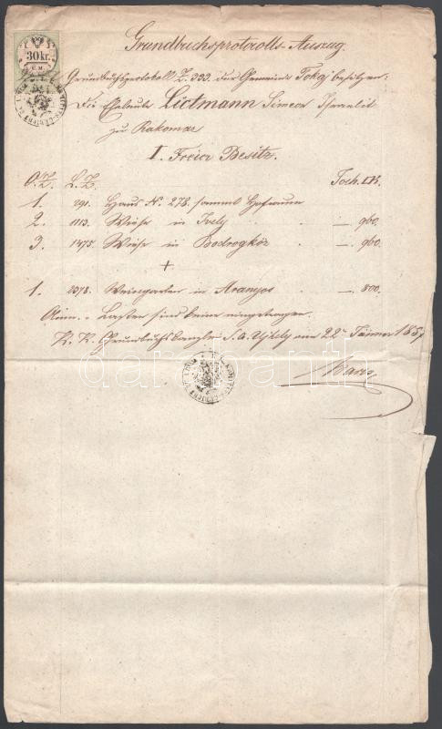 Leírás: cca 1854 Tokaj földhivatali kivonat 30kr CM. illetékbélyeggel