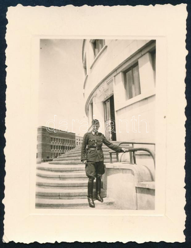 Leírás: 1941 Magyar katona az újvidéki (Délvidék) báni palota előtt, fotó feliratozva, 8×6 cm