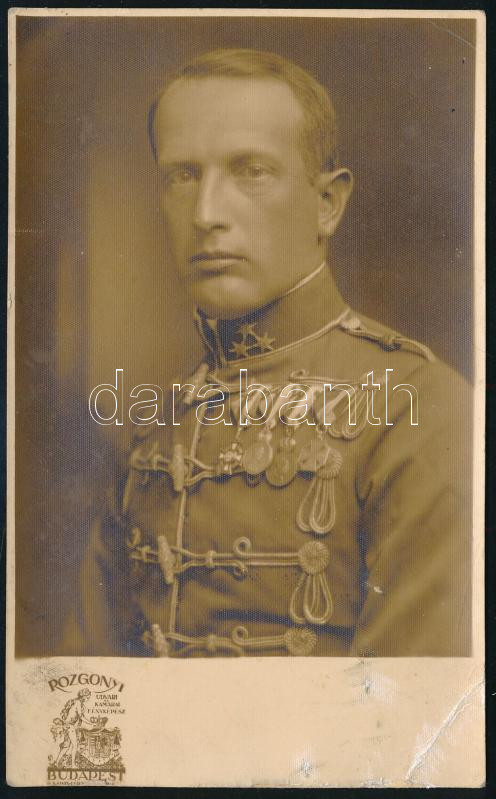 Leírás: cca 1930 Katona kitüntetésekkel, fotólap Rozgonyi műterméből, sérült, 13×9 cm