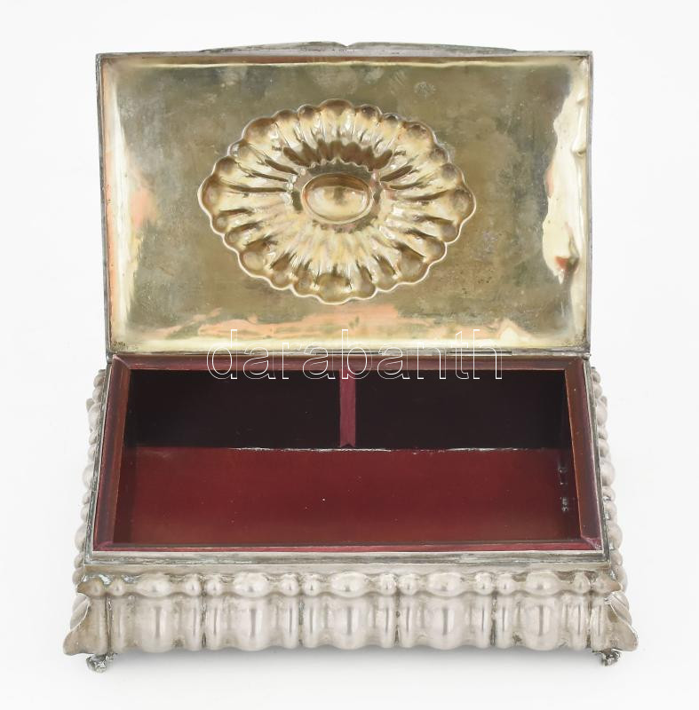 Leírás: Alpakka cukordoboz. Jelzett KN jelzéssel, fa betéttel apró horpadásal 19x12 cm