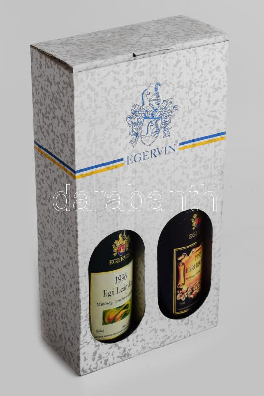 Leírás: Egervin Egri Leányka félszáraz fehérbor 1996, 0,75l, 11% + Egervin Egri Bikavér száraz vörösbor 1995, 11,5%, 0,75l, karton díszdobozban.