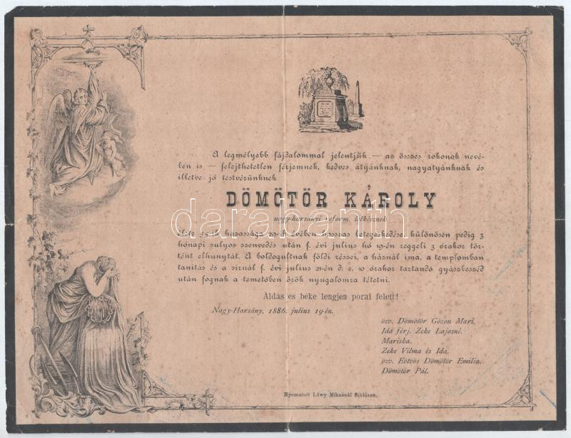 Leírás: 18886 Nagyharsány, Dömötör Károly lelkész halotti értesítője