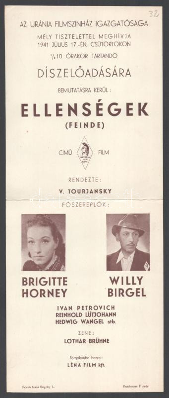 Leírás: 1941 Az Uránia Filmszínház Igazgatóságának meghívása az "Ellenségek" című film díszelőadására