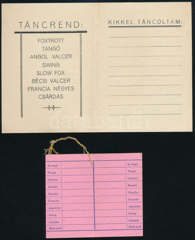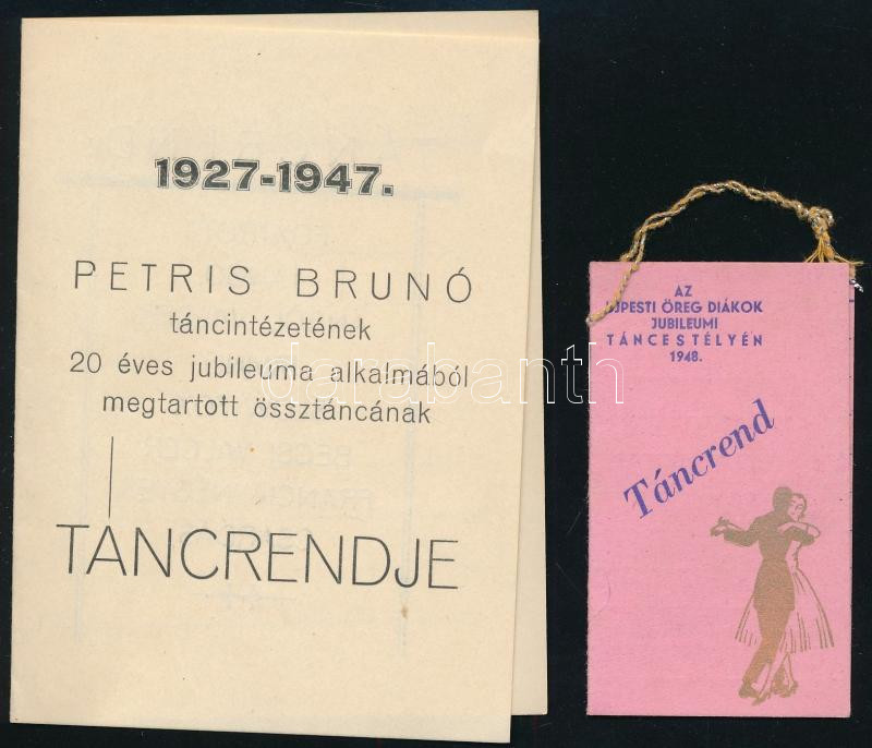 Leírás: 1947, 1948 2 db táncrend - Petris Brunó táncintézetének táncrendje, Az Újpesti Öreg Diákok Jubileumi táncestélyének táncrendje