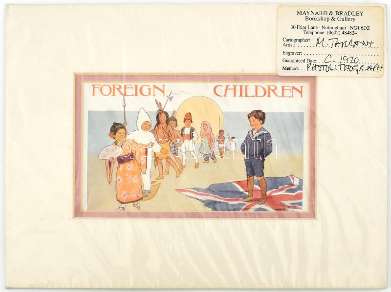 cca 1920 Margaret Tarrant (1888-1959): "Foreign Children". Színes nyomat (fotolitográfia), papír. Paszpartuban, bontatlan fóliában, látható méret: 9x15 cm, teljes: 19,5x26,5 cm