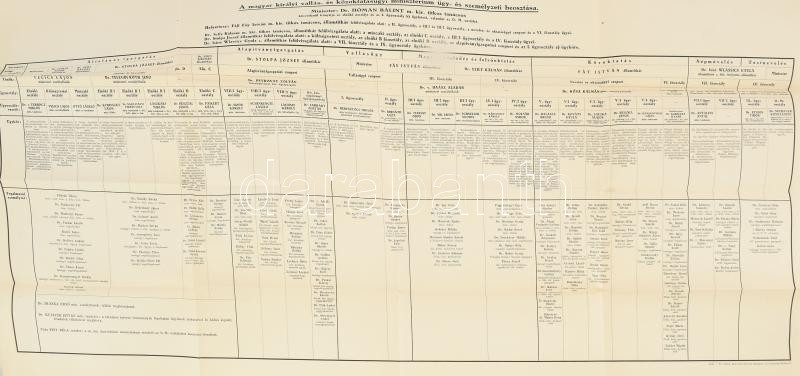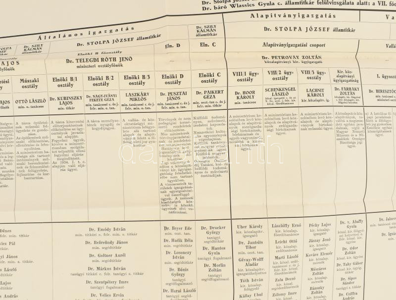 cca 1939 A magyar királyi vallás- és közoktatásügyi minisztérium ügy- és személyzeti beosztása (miniszter: Dr. Hóman Bálint), nagyméretű táblázat, Bp., Kir. M. Egyetemi Nyomda, 94,5x48 cm