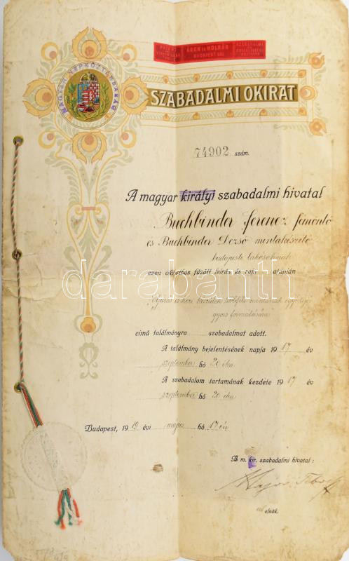1919 Bp., Szabadalmi Okirat Magyar Népköztársaság felülbélyegzéssel, h... https://www.darabanth.com/hu/474-Gyorsarveres/474.0/Mutargy-papirregiseg-egyeb/Okmanyok~500020/1919-Bp-Szabadalmi-Okirat-Magyar-Nepkoztarsasag-felulbelyegzessel-hajtott~II3221266
