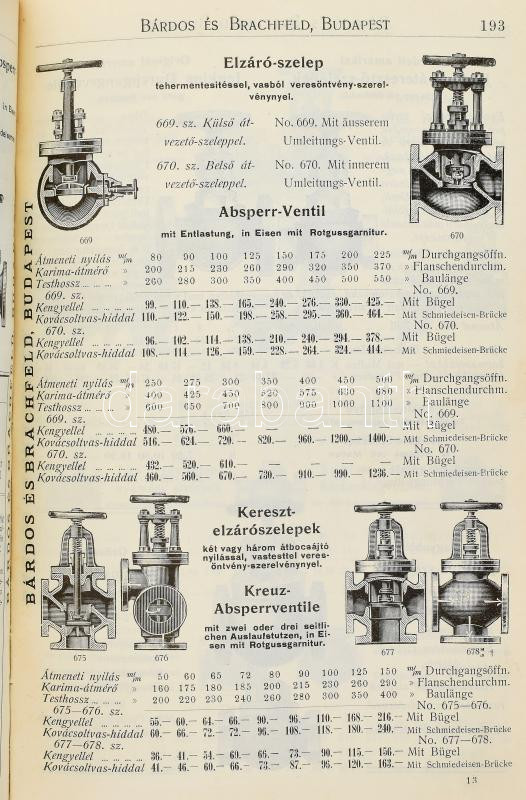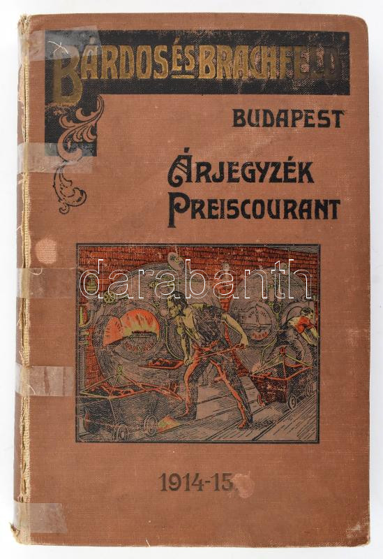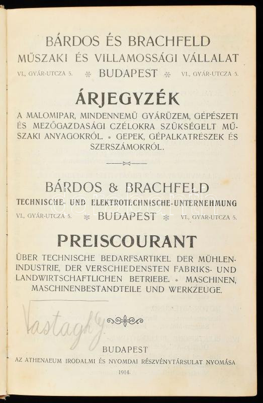 1914 Bárdos és Brachfeld Műszaki és Villamossági Vállalat, Budapest. Árjegyzék a malomipar, mindennemü gyárüzem, gépészeti és mezőgazdasági czélokra szükségelt műszaki anyagokról. Gépek, gépalkatrészek és szerszámokról. Bp., 1914, Athenaeum-ny., 1 t.+ 703+(1) p.+ 1 t. Rengeteg szövegközti illusztrációval. Magyar és német nyelven. Kiadói illusztrált, festett egészvászon-kötés, sérült, ragasztott gerinccel, belül a lapok nagyrészt jó állapotban. Ritka!