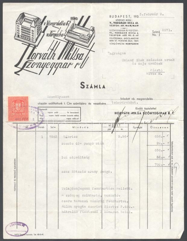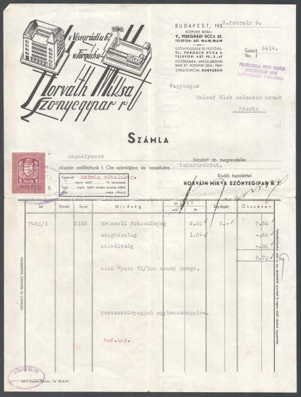 1933 Horváth Miksa szőnyegggyár két összetartozó fejléces számla https://www.darabanth.com/hu/474-Gyorsarveres/474.0/Mutargy-papirregiseg-egyeb/Reklam~1000005/1933-Horvath-Miksa-szonyegggyar-ket-osszetartozo-fejleces-szamla~II3214171