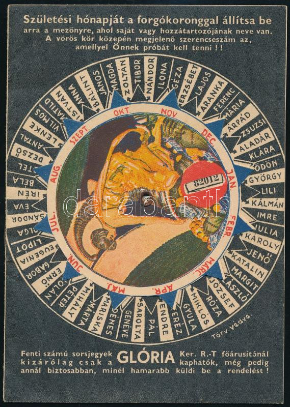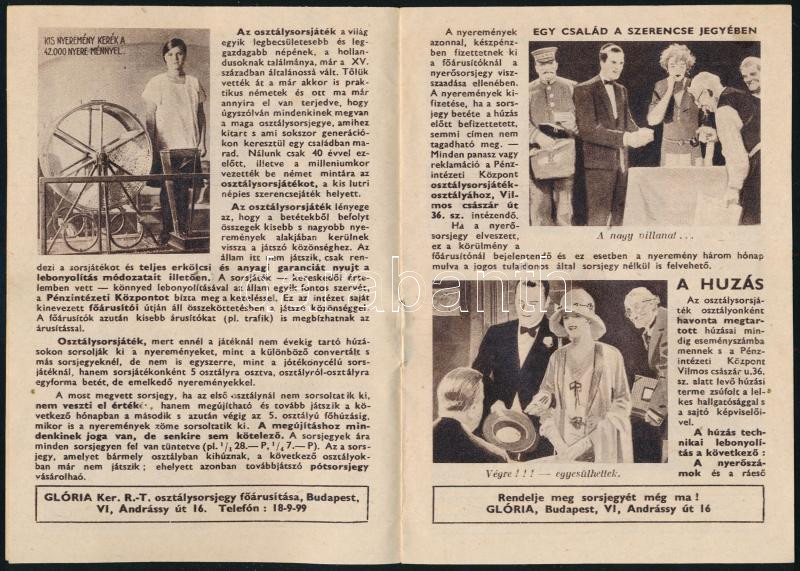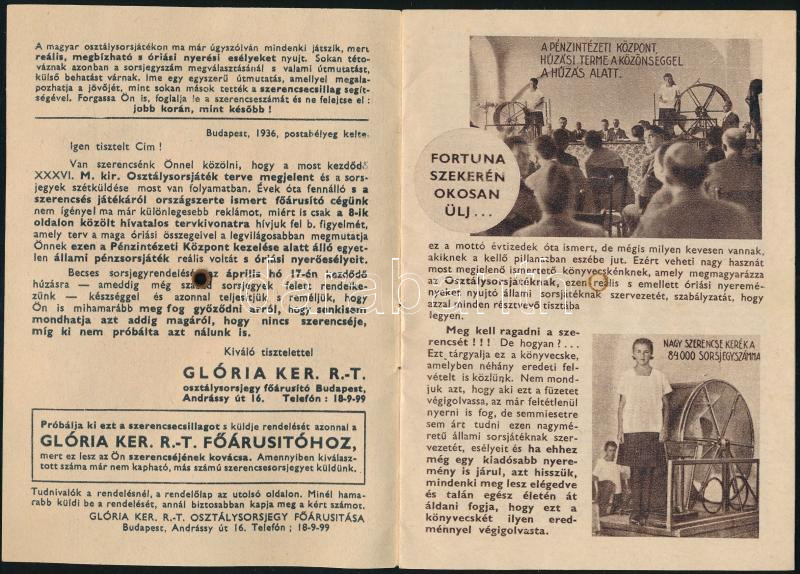 Leírás: 1936 Glória Kereskedelmi R.T. osztálysorsjáték reklámprospektus, a címlapon szerencseszám-koronggal, jó állapotban