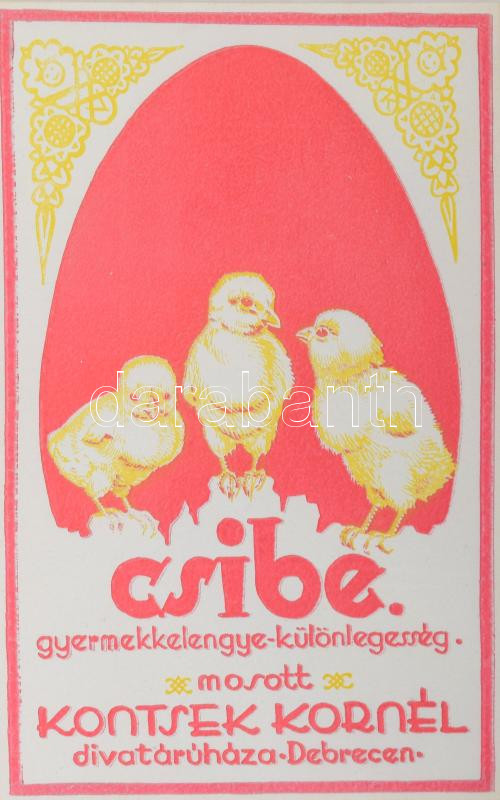 cca 1930 Kontsek Kornél Divatáruháza, Debrecen - Csibe gyermekkelengye... https://www.darabanth.com/hu/474-Gyorsarveres/474.0/Mutargy-papirregiseg-egyeb/Reklam~1000005/cca-1930-Kontsek-Kornel-Divataruhaza-Debrecen-Csibe-gyermekkelengye-kulonlegesseg-grafikus~II3216728