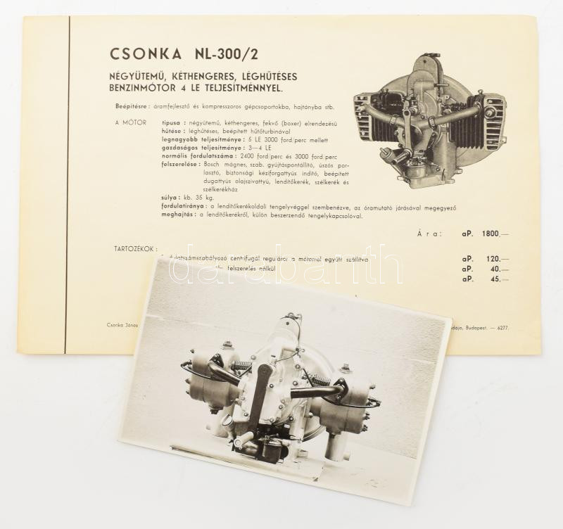 Leírás: cca 1940 Csonka NL-300/2 négyütemű, kéthengeres benzinmotor prospektus, Bp., Mérnökök Nyomdája + a motorról készült fotólap, 8,5x13,5 cm