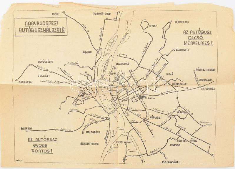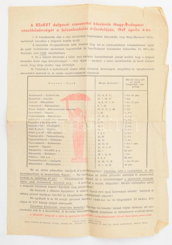 1949 BSzKRT Nagy-Budapest autóbuszhálozata, Bp., Szikra-ny., a hátoldalán propaganda köszöntővel a felszabadulás napja (április 4.) alkalmából, szakadt, 20x29 cm. Nagy-Budapest, hivatalosan 1950. január 1. jön létre. A BSZKRT megszűnik 1949. szeptember 30.-ával.