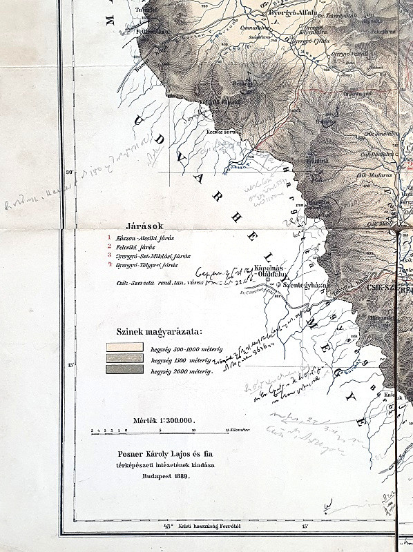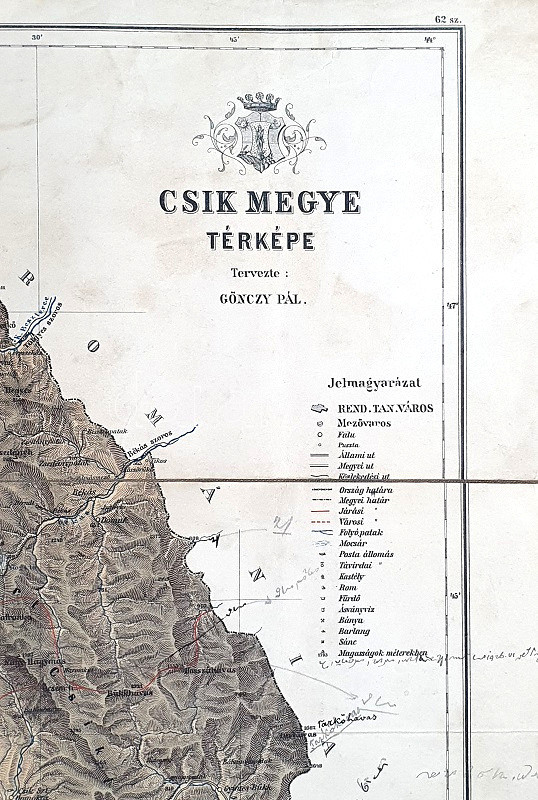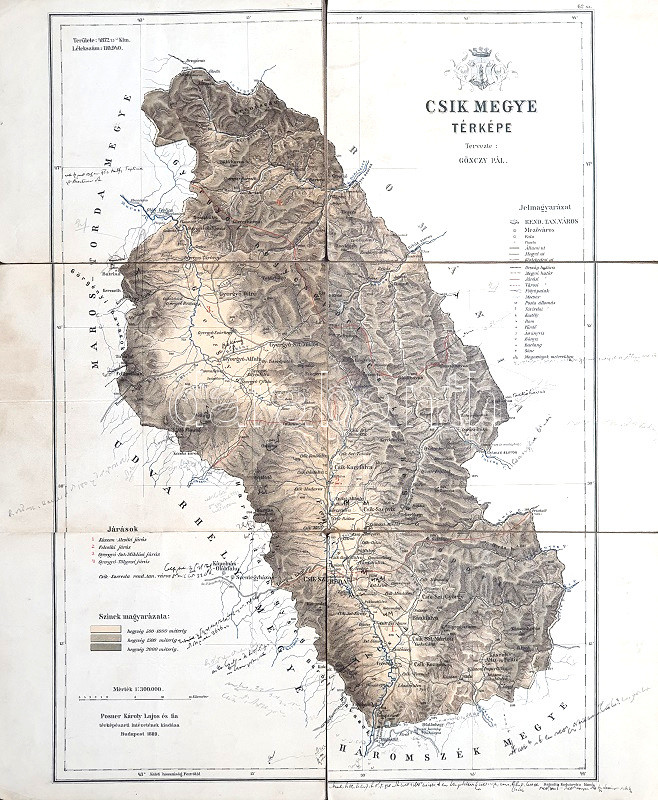 [Térkép] Csík megye térképe. Tervezte: Gönczy Pál. Mértéke: 1 : 300.000 (1889). Budapest, 1889. Posner Károly Lajos és Fia Térképészeti Intézete. Színes térkép, mérete: 445x320 mm egy 470x395 mm méretű térképlapon. Az 1876. évi vármegyerendezés után szükségessé vált új, a közoktatásban is haszonnal forgatható megyetérképeket készíteni. A feladatra Gönczy Pál közoktatásügyi államtitkár Kogutowicz Manó (1851-1908) térképészt kérte fel, a magyar kartográfia korszakos egyéniségét, aki 1884-1890 között 30 vármegye nagy felbontású térképét készítette el. E térképkiadás mellékterméke a közigazgatási áttekintő térképek sora, melyből példányunk a székelyföldi, magas hegységi, határ menti Csík vármegye területét ábrázolja. Színes térképünk a hegy- és vízrajzi részleteken kívül feltünteti a megye járási beosztását, közúthálózatát, rendezett tanácsú városát, mezővárosait, falvait és pusztáit, kastélyait, a hegyvidéki megye sajátosságai miatt fürdőit, ásványvíz-lelőhelyeit, bányáit és barlangjait. Egyes települések mellett az elérhető postai és távirdai szolgáltatások is feltüntetve. A térképen jól tanulmányozható a megye közeledési infrastruktúrájának fejlődése is: közutak ugyan felkapaszkodnak a havasokba, de a vasút még nem épült meg. A megye területe domborzati szempontból színezve, a szomszéd megyék vízrajzi, közlekedési és településhálózati részletei fekete (illetve kék) színnel nyomottak, a Kárpátokon túli román területek esetén csak vízrajzi részletek. A térkép felirata a jobb felső sarokban, felette a megye címere lebeg, a jelmagyarázat a bal alsó sarokban. A térképen körben kézírásos jegyzetek, apró, halvány foltosság. Jó állapotú lap, vászonra kasírozva, hajtogatva.