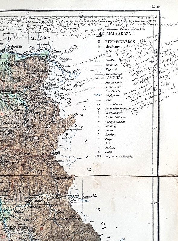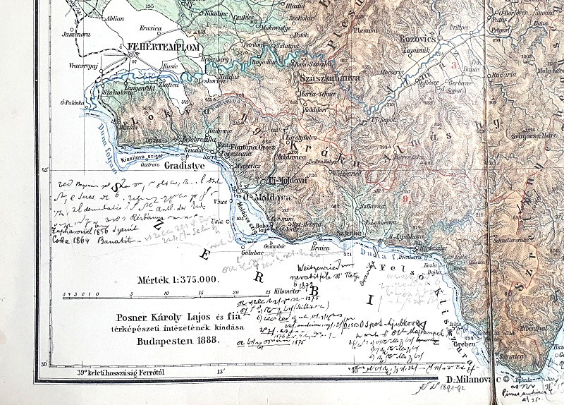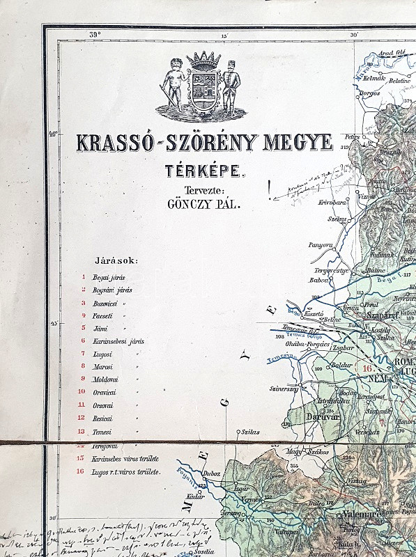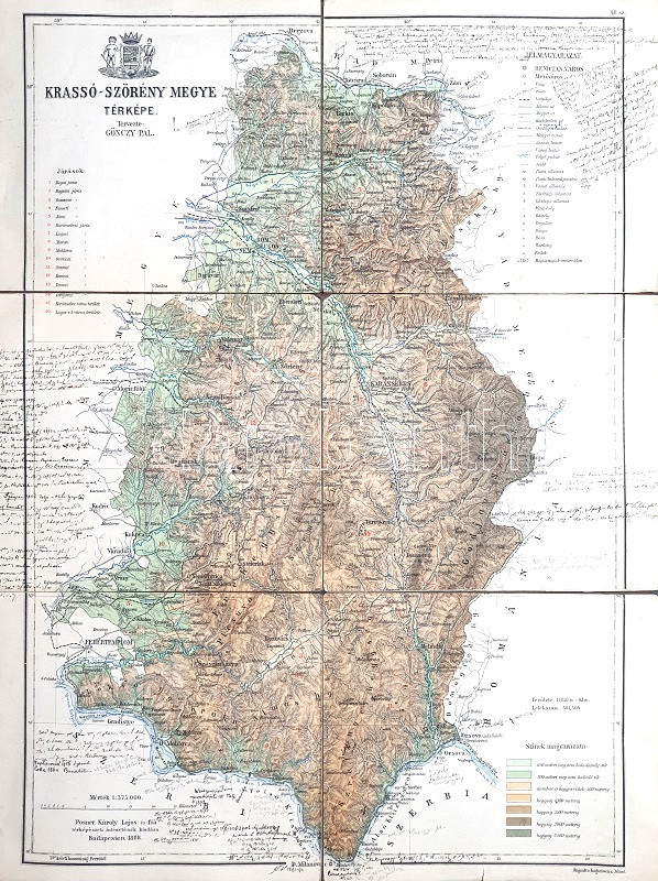 [Térkép] Krassó-Szörény megye térképe. Tervezte: Gönczy Pál. Mértéke: 1 : 375.000. (1888) Budapest, 1888. Posner Károly Lajos és Fia Térképészeti Intézete. Színes térkép, mérete: 495x350 mm egy 520x395 mm méretű térképlapon. Az 1876. évi vármegyerendezés után szükségessé vált új, a közoktatásban is haszonnal forgatható megyetérképeket készíteni. A feladatra Gönczy Pál közoktatásügyi államtitkár Kogutowicz Manó (1851-1908) térképészt kérte fel, a magyar kartográfia korszakos egyéniségét, aki 1884-1890 között 30 vármegye nagy felbontású térképét készítette el. E térképkiadás mellékterméke a közigazgatási áttekintő térképek sora, melyből példányunk a alsó-magyarországi, az Al-Duna és a Maros folyó, illetve a Bánság és a román határ között meghúzódó, bányászati jellegű, hegyvidéki Krassó-Szörény vármegye területét ábrázolja. A határőrvidékből megszervezett megye valamennyi vármegyénkből utolsóként jött létre: csupán 1881-ben létesült. Színes térképünk a hegy- és vízrajzi részleteken kívül feltünteti a megye járási beosztását, vasút- és közúthálózatát, rendezett tanácsú városait, mezővárosait, falvait és pusztáit, kastélyait, a hegyvidéki és Duna-menti megye sajátosságai miatt bányáit, barlangjait, fürdőhelyeit és gőzhajó-állomásait. Egyes települések mellett az elérhető takarékpénztári, postai és távirdai szolgáltatások is feltüntetve. A térképen jól tanulmányozható a megye közeledési infrastruktúrájának fejlődése is: a vasút jobbára elkerüli a hegyvidéki szakaszokat, az Al-Dunánál csak az első gőzhajóállomásig halad, fontos vasúti ütőér viszont a megyét észak-déli irányban keresztülszelő, Lugos-Orsova-i vonal. A megye területe domborzati szempontból színezve, a szomszéd megyék vízrajzi, közlekedési és településhálózati részletei fekete (illetve kék) színnel nyomottak, a Kárpátokon túli román területek esetén döntően csak vízrajzi részletek. A térkép felirata a jobb felső sarokban, felette a megye címere lebeg, a jelmagyarázat a bal alsó sarokban. Térképünkön körben kézírásos jegyzetek, apró, halvány foltosság. Jó állapotú lap, vászonra kasírozva, hajtogatva.