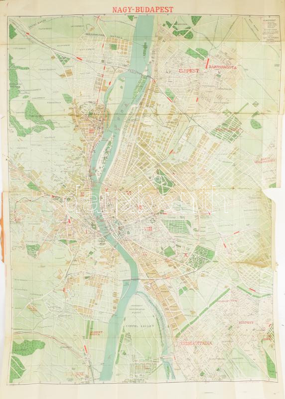 cca 1920-1930 Nagy-Budapest térképe. Ujpest, Kispest, Pestszenterzsébet, Csepel, Pestújhely, Rákospalota, Rákosszentmihály, Albertfalva, Budafok feltüntetésével. Tervezte: Stoits György, 1:18.000, szakadt, Bp., Bíró Miklós, Gottlieb Lith.-ny., 108x76 cm.
