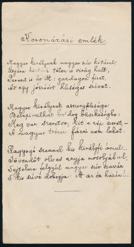 Leírás: Sajó Sándor (1868-1933) irredenta költő, akadémikus Koronázási emlék c. versének autográf vers kézirata.