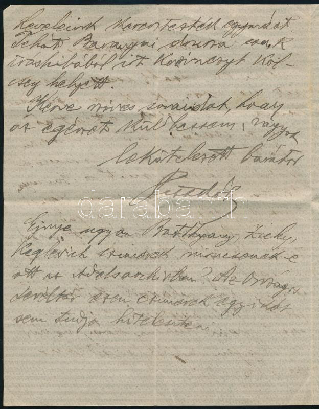 Leírás: ca 1927 Alsópetőfalvi Pettkó Béla (1862-1942) történész, levéltáros autográf levele a Wenckheim család csalástörténete vonatkozásában 2 beírt oldal