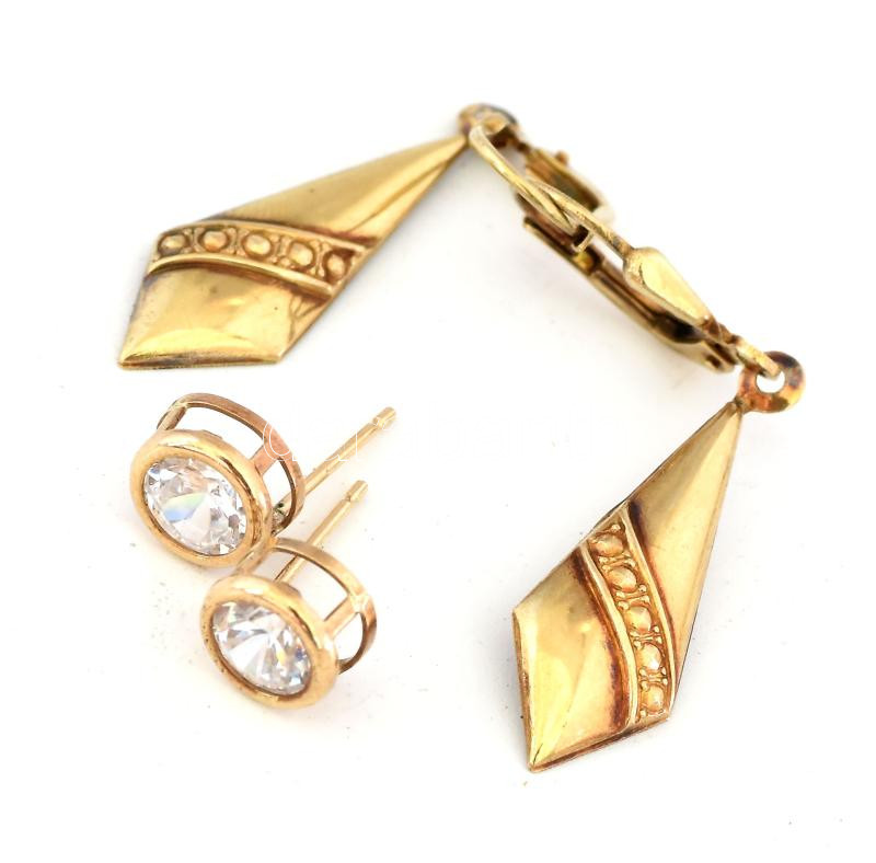 Leírás: Arany (Au) 8K lógós fülbevalópár + köves fülbevalópár sróf nélkül, jelzett és jelzés nélkül, h: 3,5 cm, bruttó: 2,3 g