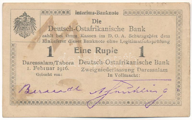 German East Africa 1916. 1 Rupie... https://www.darabanth.com/hu/474-Gyorsarveres/474.0/Numizmatika/Kulfoldi-bankjegyek~1500017/Nemet-Kelet-Afrika-1916-1R-TF-folt-German-East-Africa-1916-1-Rupie-CF-spot-Krause-P2319~II3216458