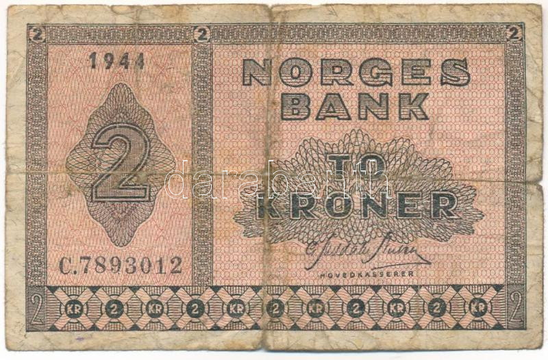 Norway 1944. 2 Kroner C:VG ... https://www.darabanth.com/hu/474-Gyorsarveres/474.0/Numizmatika/Kulfoldi-bankjegyek~1500017/Norvegia-1944-2K-TVG-folt-kis-szakadas-Norway-1944-2-Kroner-CVG-spot-small-tear-Karuse-P231~II3216456