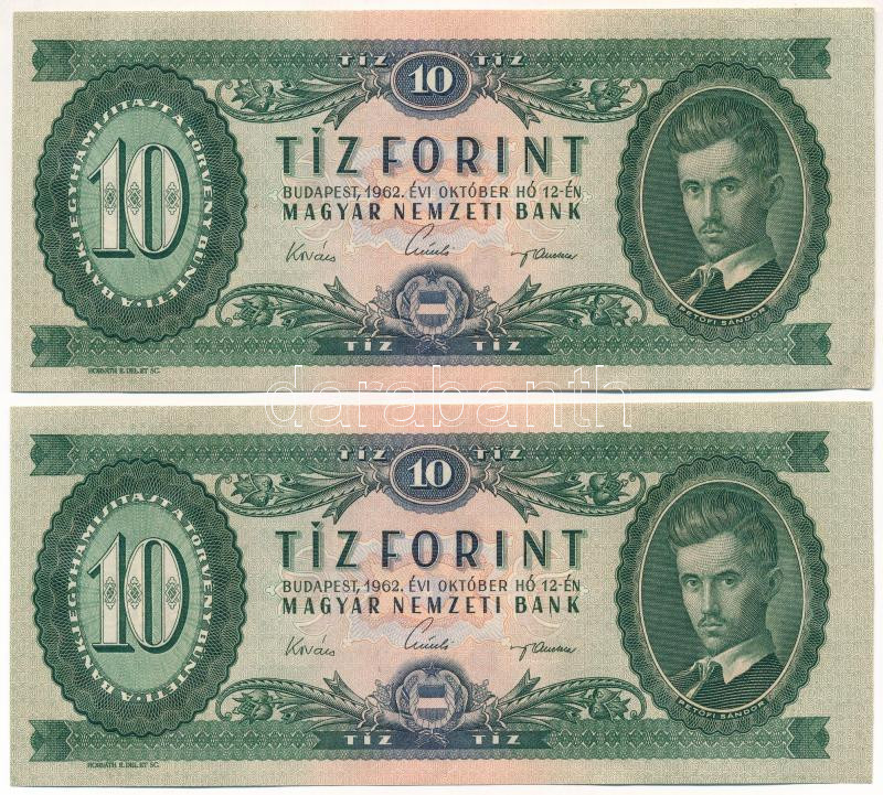 Leírás: 1962. 10Ft (2x) egyugrású sorszámokkal "A 475 043416 - A 475 043418" T:AU hullámos papír, saroktörés Adamo F6