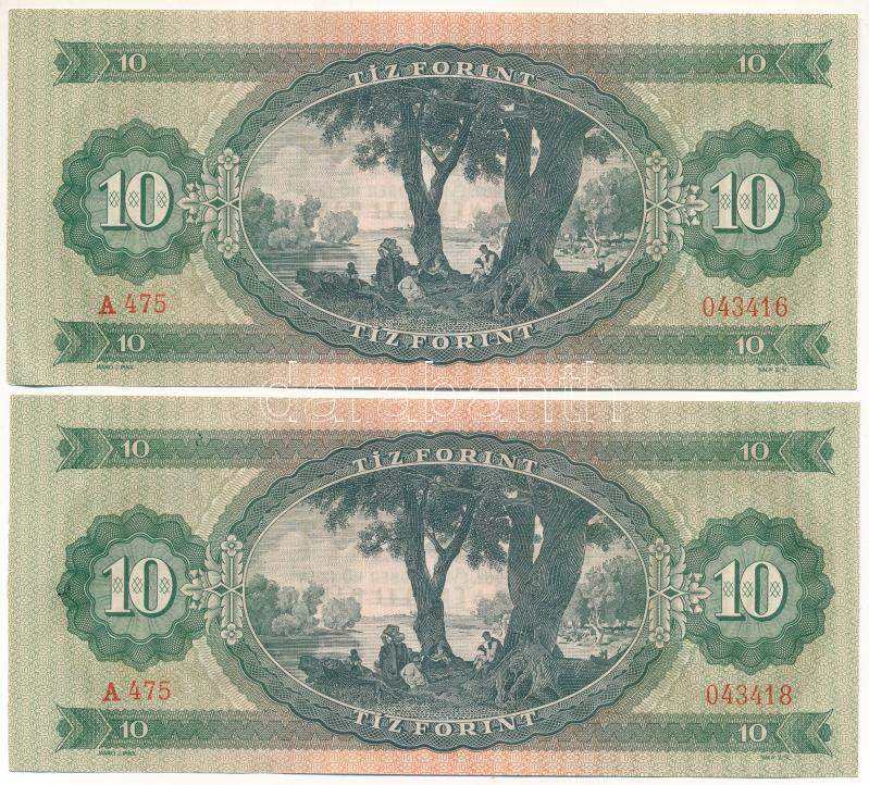 1962. 10Ft (2x) egyugrású sorszámokkal "A 475 043416 - A 475 043418" T... https://www.darabanth.com/hu/474-Gyorsarveres/474.0/Numizmatika/Magyar-bankjegyek~1500008/1962-10Ft-2x-egyugrasu-sorszamokkal-A-475-043416-A-475-043418-T-AU-hullamos-papir-~II3215928