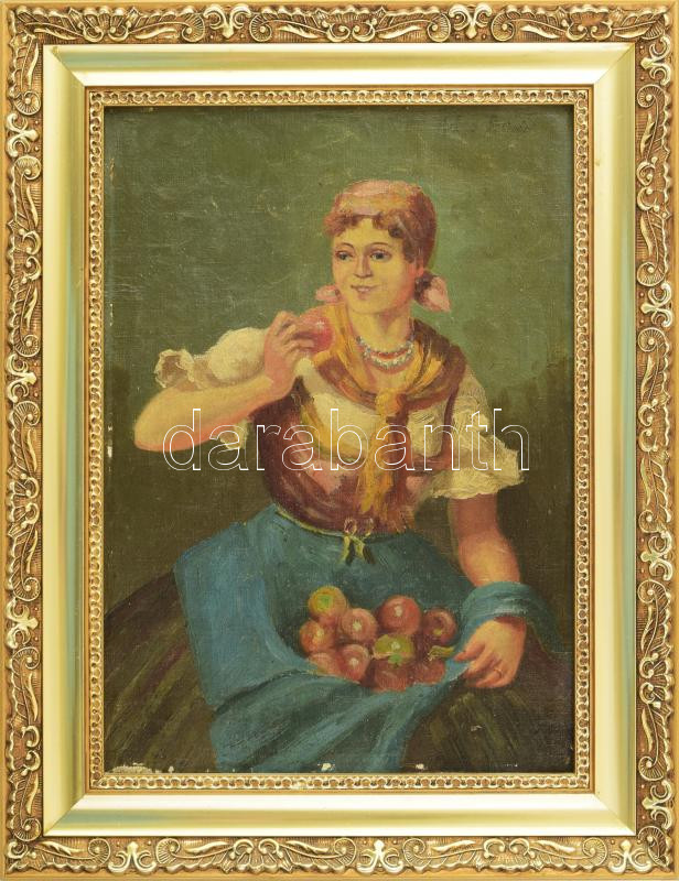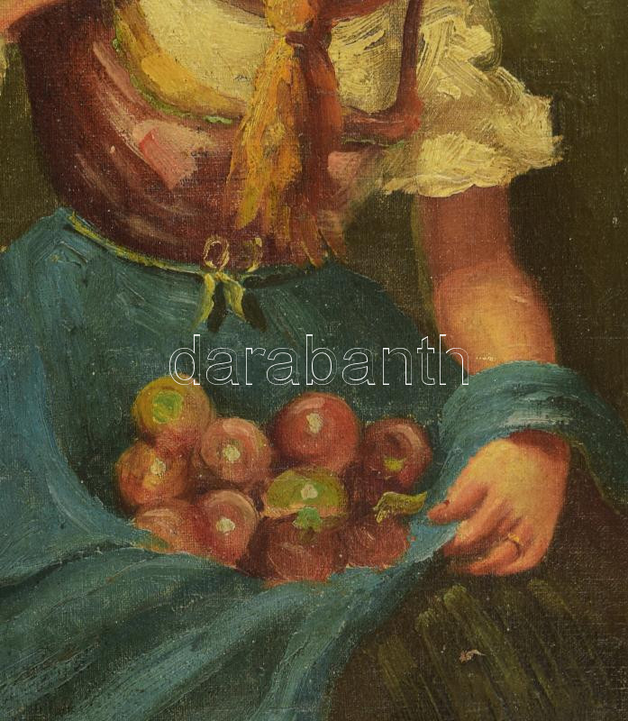 Leírás: Jelzés nélkül: Lány gyümölcskosárral. Olaj, vászon, dekoratív fakeretben, vászon szélén korábbi keretezésből fakadó apró sérülésekkel, 35×25 cm