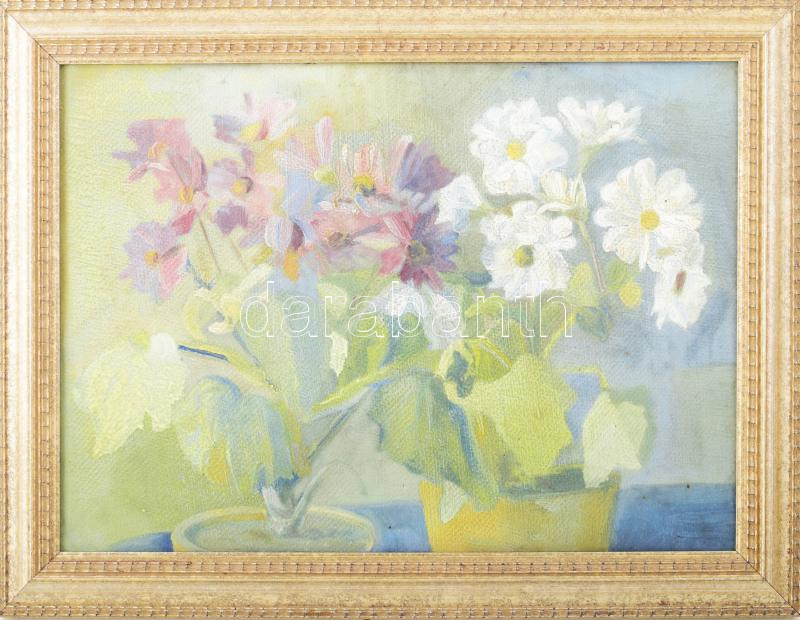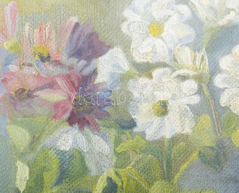 Leírás: Jelzés nélkül: Virágok. Olaj, karton. Dekoratív fakeretben, hátoldalán kanadai galéria címkéjével. 30×40 cm