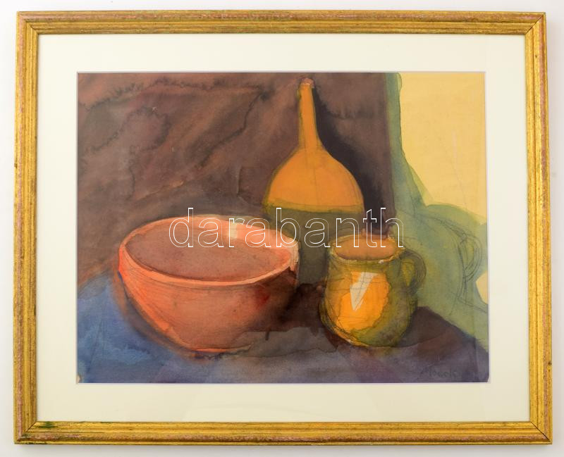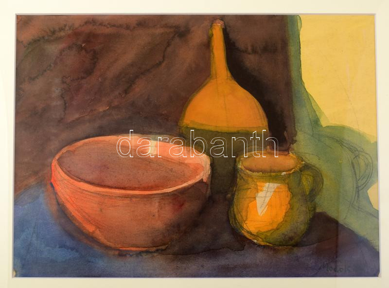 Leírás: Modok jelzéssel: Csendélet. Akvarell, ceruza, papír, jelzett, üvegezett fakeretben, 29×40,5 cm