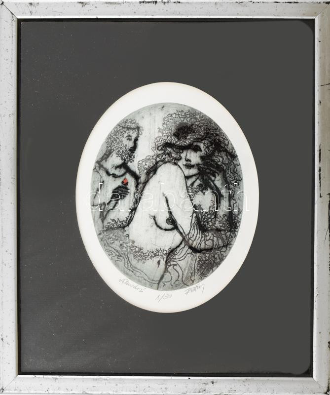 Leírás: Olvashatatlan jelzéssel: Álmodozó (női akt). Rézkarc, papír. Számozott (1/30). 12x10 cm. Üvegezett fakeretben.