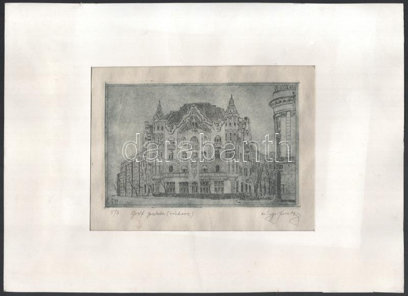 Leírás: Olvashatatlan jelzéssel: Gróf palota (Szeged). Rézkarc, papír, számozott (5/3), paszpartuban, 10,5x16,5 cm