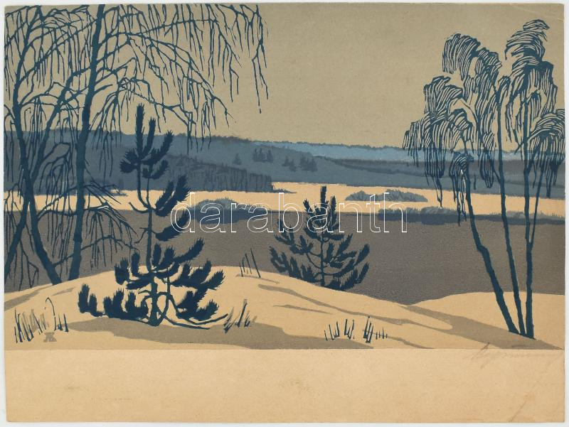 Leírás: Olvashatatlan jelzéssel: Táj. Linómetszet, papír, jobb alsó sarkában töréssel, körbevágva, 24,5×40 cm