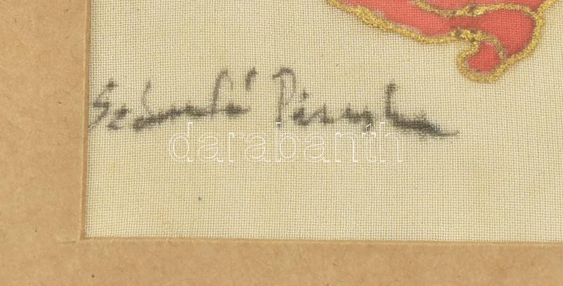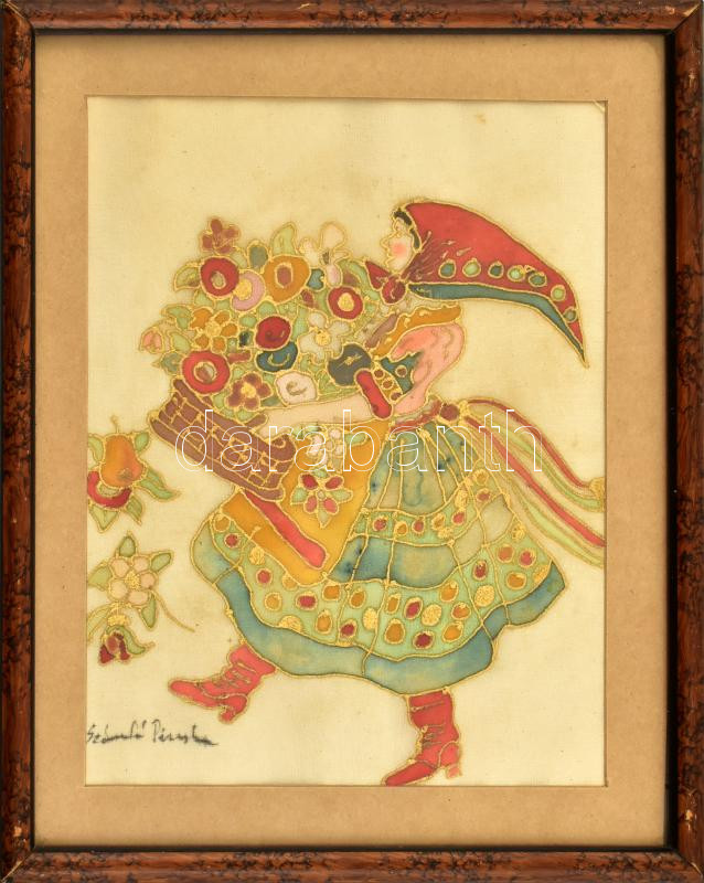 Leírás: Szántó Piroska jelzéssel: Hölgy virágkosárral. Akvarell, selyem. Üvegezett fa keretben. 21x16 cm