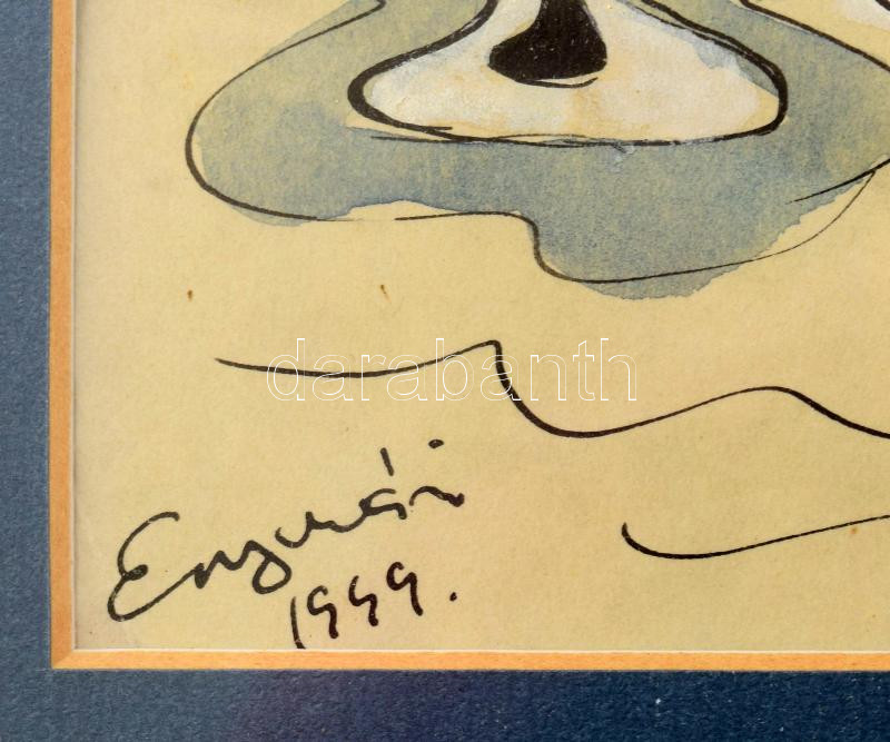 Leírás: Enyvvári Herbert (működött 1930-50 körül): Balatoni kaland (karikatúra), 1949. Akvarell, tus, papír, jelzett, üvegezett fakeretben, 29x19,5 cm