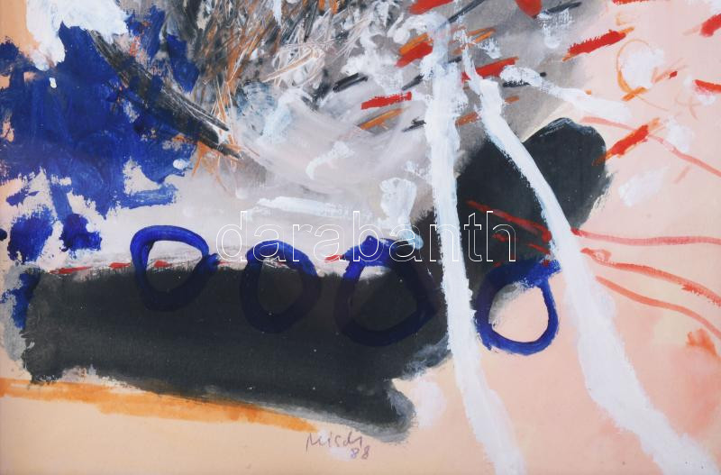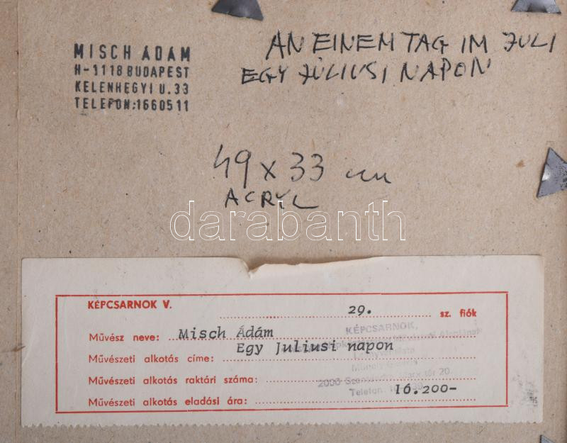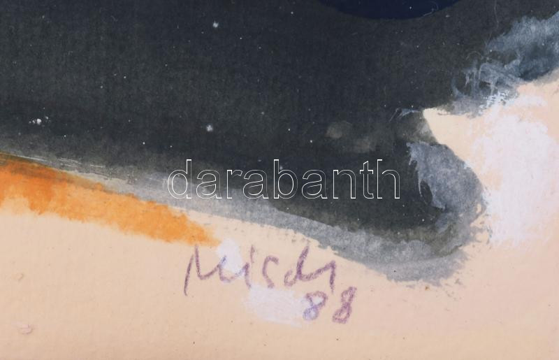 Misch Ádám (1935-1995): Egy júliusi napon/An einem Tag im Juli, 1988. Akril, papír, jelezve középen lent (Misch 88). Hátoldalán Misch Ádám autográf feliratával és bélyegzésével valamint Képcsarnok Vállalat szentendrei Műhely Galéria címkéjével. Üvegezett, fakeretben, 49x33 cm. / Adam Misch (1935-1995): On a day in july, 1988. Acrylic on paper, signed, with autograph description and stamp on the reverse, framed.