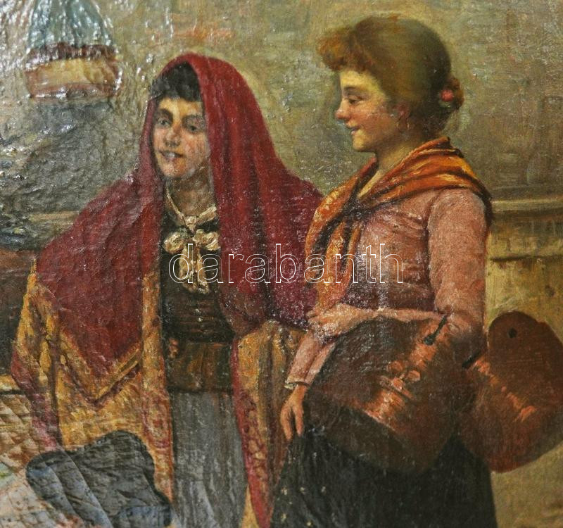 Pietro Toretti (1888-1927): Piaci jelenet. Olaj, vászon, jelezve jobbra lent. Reprezentatív, kissé sérült fakeretben, 50×72 cm. KIZÁRÓLAG SZEMÉLYES ÁTVÉTEL, NEM POSTÁZZUK / ONLY PERSONAL COLLECTION IN OUR OFFICE!